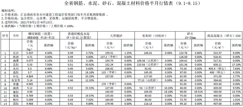 全省鋼筋、水泥、砂石、混凝土材料價(jià)格半月行情表(9.1-9.15)